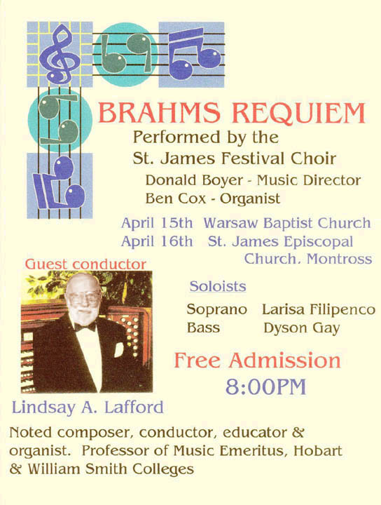 This piece was performed in April 2000 by the St. James Festival Choir (guided by Don Boyer) and began what has turned into a wonderful tradition in Montross, Virginia.
